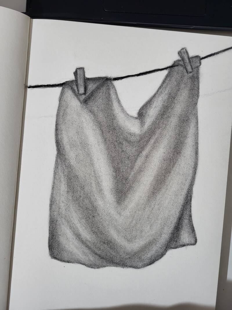 charcoal artworks of a shoe, socks and a towel with highlights with pastelchalk.